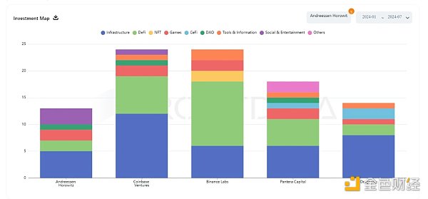 A16Z(AndreessenHorowitz):主要投資于基礎設施、DeFi和游戲,也有一些投資于NFT和社交娛樂。