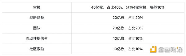 根據(jù)Whitepaper顯示:JUP 總量為 100 億枚,現(xiàn)在流通量為 13.5 億枚,流通率為 13.5% 。初始流通量為 13.5 億枚,其中 10 億枚用于空投, 2.5 億枚用于Launchpool,另外還有 5000 萬枚分別用于CEX做市和鏈上LP需求。總體的Tokens分配如下: