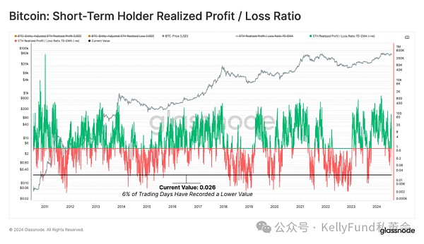 如果我們查看短期持有者的盈利供應百分比,我們可以看到,只有7%的供應處于盈利狀態,這與2023年8月拋售潮中的情況類似。