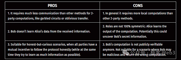 在現(xiàn)實(shí)中,F(xiàn)HE外包模式通常被視作TEE等安全執(zhí)行環(huán)境的替代方案,F(xiàn)HE的安全性基于密碼學(xué)算法,而不依賴于硬件等實(shí)體設(shè)備。因此,F(xiàn)HE完全不受被動(dòng)側(cè)信道攻擊或云端服務(wù)器被攻擊的影響。想象一下,當(dāng)某人需要外包出去一些計(jì)算任務(wù),但數(shù)據(jù)非常敏感,他可能不愿意使用搭建在AWS上的虛擬機(jī)(VM),因?yàn)檫@類基于云端的服務(wù)器背后往往存在更高級的控制人。他也可能對SGX或TEE這類東西猶豫不決,因?yàn)檫\(yùn)行TEE的主機(jī)可以監(jiān)控該計(jì)算任務(wù)在執(zhí)行時(shí)產(chǎn)生的功耗或運(yùn)行時(shí)間等,可能通過這些數(shù)據(jù)來推斷出一些信息。