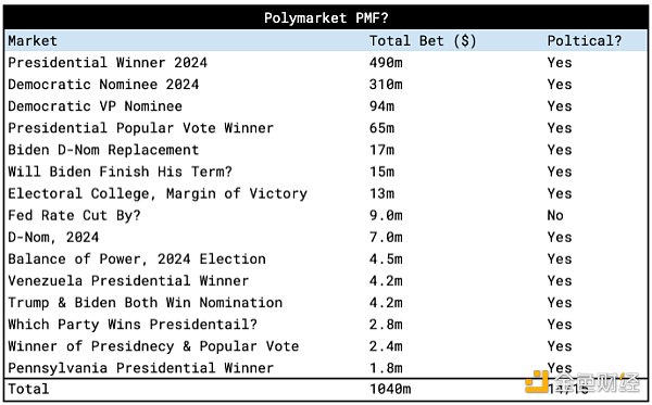在看到這些數據后,Polymarket是否實現了PMF的問題變得越來越重要。數據表明,絕大多數Polymarket的使用都集中在政治市場和美國大選上——這使Polymarket成為了“閃亮的新玩具”。
