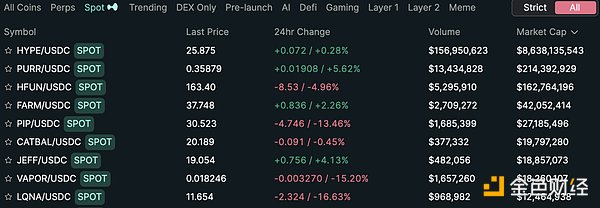 Hyperliquid目前市值排名靠前的現貨Tokens