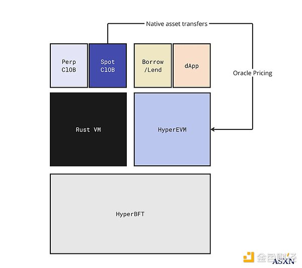 HyperEVM與Hyperliquid的L1具有互操作性,如L1的預言機就可以供HyperEVM使用,同時部分幣種的轉賬也可以在兩個VM之間互通。(無法全部互通,因為L1上的資產是「許可」的,只包含USDC和通過HIP-1生成的資產,而HyperEVM的資產要多的多)