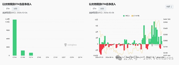 總的來說ETHETF的凈流入進展相對BTCETF較慢。在今年11月29日是分界點,ETHETF開始大幅凈流入,當(dāng)天凈流入3億美金,是之前4個月累計凈流入的2倍。此后一段時間內(nèi),ETHETF開始持續(xù)凈流入,但我們也觀察到例如孫宇晨等cryptonative老OG開始拋售Ethereum,目前呈現(xiàn)的是圈內(nèi)拋售,圈外ETF增持的趨勢。截止12月26日,ETF累計持有3%的ETH。