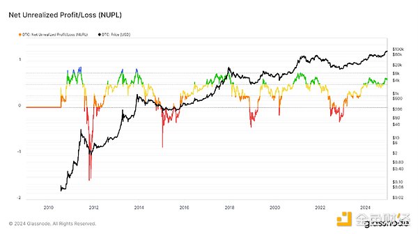 (注:BTC未實現凈利潤/虧損是相對未實現利潤與相對未實現虧損之間的差額,其閾值分別設置為0.0、0.25、0.5和0.75,可顯示整個BTC宏觀周期中的不同情緒。)