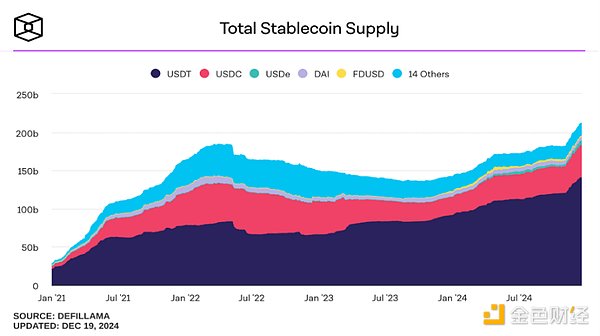 2024年的DeFi總鎖倉量呈現持續上升趨勢,尤其是在第四季度,TVL(總價值鎖倉量)快速攀升,截止至12月17日,到歷史新高約2187億美元。由于Aave和Compound等去中心化借貸平臺提供的利率通常高于傳統銀行存款利率以及去中心化方式運行可以極大降低風險的優勢,使得DeFi協議展現出廣闊的潛力,成為加密市場一大亮點。其中,流動性質押(LiquidStaking)較年初的比例增加,表明權益證明(PoS)協議對鎖倉量的推動作用增強。