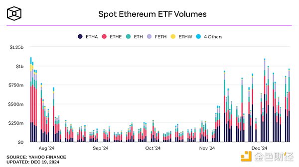 截止12月18日,Bitcoin現貨ETF繼續表現強勁,單日資金量達到2.75億美元,已保持連續12月內的凈流入。12月17日,根據投資機構K33Research數據,Bitcoin現貨ETF的資金規模在上市交易不到一年的時間里突破至1293億美元,超過傳統黃金ETF的1289億美元。從七月到十一月,ETHETF的成交量呈現出先下降后回升的趨勢,投資者對Bitcoin現貨ETF及Ethereum現貨ETF信心持續走強。