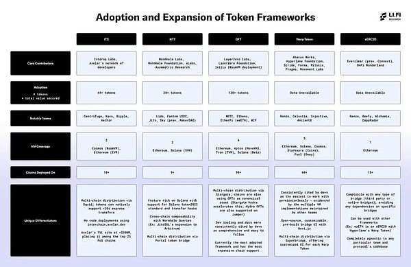 此字段反映了每個框架部署的鏈的數(shù)量,即每個應用程序或Tokens發(fā)行者如果決定使用特定框架,可以支持的鏈的數(shù)量。這與應用程序可以接觸的市場和DeFi生態(tài)系統(tǒng)的數(shù)量直接相關。更高的鏈部署意味著更廣泛的流動性訪問。