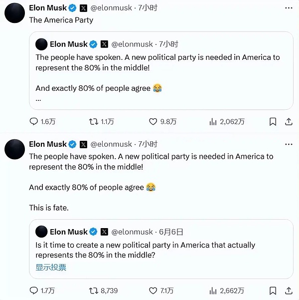 投票結(jié)果顯示,超563萬(wàn)用戶參與,其中80.4%支持建立新黨,僅19.6%反對(duì)。馬斯克隨即轉(zhuǎn)發(fā)結(jié)果,宣布新政黨將命名為“美國(guó)黨”(TheAmericaParty),并稱:“人民已經(jīng)發(fā)出了聲音,這就是命運(yùn)!”