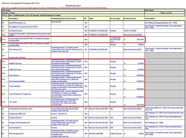 值得注意的是,這份長達234頁的財務文件中,多達上百項收入屬于不足201美元以內的款項,但仍然被詳細列出。與之相對,美國前總統拜登在2024年提交的財務表格只有11頁,主要收入來源為銀行和退休賬戶等傳統來源,而民主黨總統候選人哈里斯的財務表格也只有15頁。