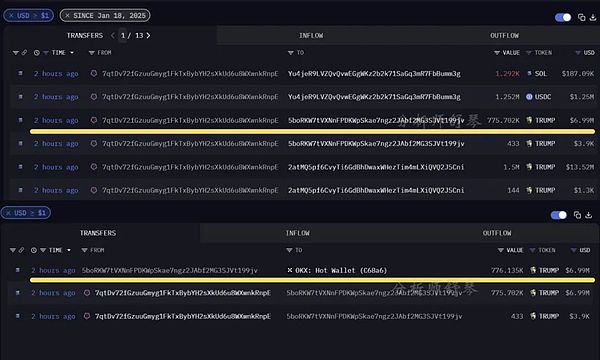 據(jù)報(bào)道TRUMP團(tuán)隊(duì)昨日向Binance和OKX發(fā)送了227.7萬(wàn)枚TRUMP(約合2050萬(wàn)美元)、125萬(wàn)枚USDC和1,292枚SOL(約合18.7萬(wàn)美元)。