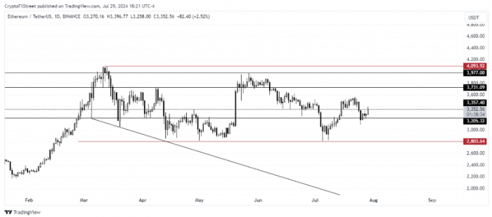 技術分析顯示,Ethereum在7月8日從2800美元的關鍵支撐位反彈后正在復蘇。盡管大多數交易者持看跌態度,但這一反彈使價格突破了3357美元的阻力位。ETH多頭/空頭比率為0.905。