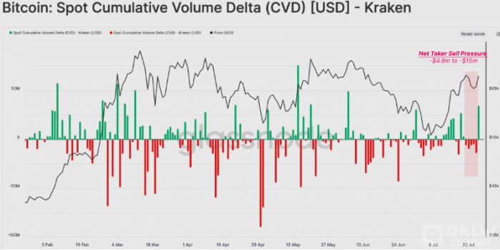 值得注意的是,累積現貨交易量增量(CVD)是衡量CEX現貨交易買賣量之間凈差的指標,在Mt. Gox分配BTC后,Kraken交易所并未出現顯著增加。報告指出:“我們可能會看到分配后的拋售壓力略有增加。這仍在典型的每日范圍內。”