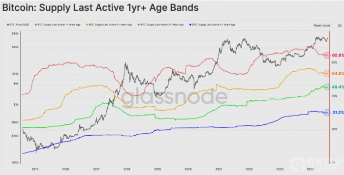 目前的Bitcoin分布顯示,投資者已經停止獲利了結,轉回“hodling”,即長期持有。這一趨勢表明,長期投資者在Bitcoin達到歷史高點之前會出售Tokens以滿足新的需求,而最近這種行為已經放緩,表明投資者逐漸回歸持有狀態。