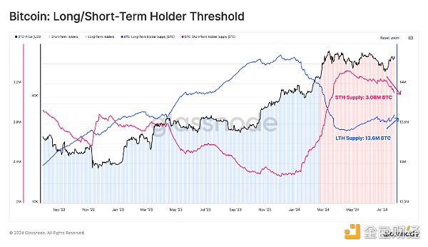 下圖顯示,長期持有者和短期持有者的大致時間界限是2024年2月下旬,他們是在此前后獲得的Tokens,當時的價格約為5.1萬美元。很可能,在ETF炒作的高峰期獲得的Tokens有很多將很快開始轉移到長期持有狀態,而且這種分化可能會加速。