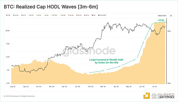 Realized Cap HODL Wave(已實現Bitcoin市值持幣曲線)指標幫助我們隔離在Tokens中鎖定持有不到三個月的美元財富。這使我們能夠評估新投資者的流入需求。