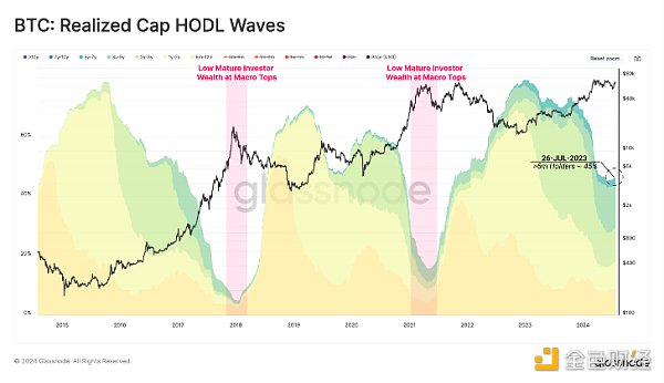 樂觀牛市的高潮的標志往往是這些新買家持有的財富達到飽和,這也是長期持有者大規模撤資的一個關鍵點。